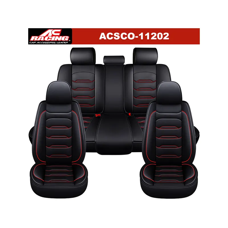 AC Racing Universal Leather Seat Cover Black W/Red Line 11Pcs